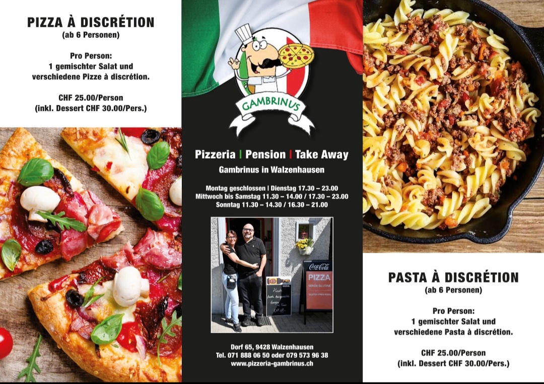 Alle weiteren Gerichte aus unserer Speisekarte kosten Take away CHF 3.00 weniger (zum Beispiel: Gnocchi al Forno Preis Speisekarte CHF 20.50 - Preis Take away CHF 17.50 | |||